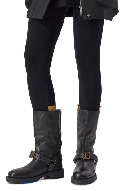 Сапоги на невысоком устойчивом каблуке и с широким голенищем выполнили из кожи. Круглый мыс акцентировали металлизированной вставкой, а союзку дополнили ремешком с лентой велкро.