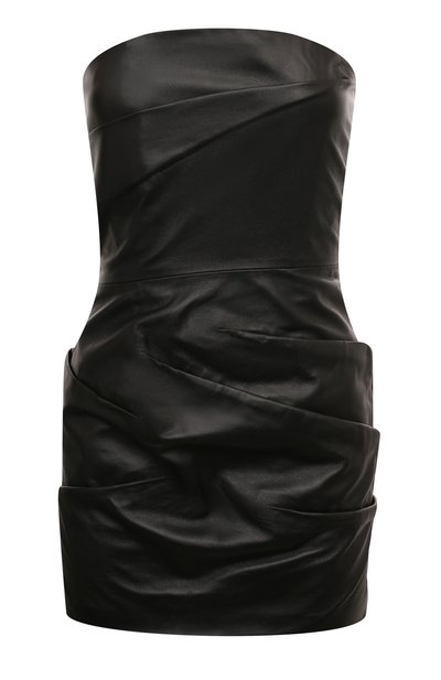 Приталенное короткое платье-бюстье, застегивающееся на молнию сзади, сшили из мелкофактурной кожи ягненка. Крупная драпировка на лифе и подоле визуально моделирует силуэт.