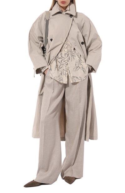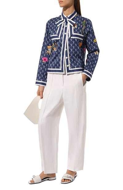 Блузу на перламутровых пуговицах сшили из шелкового твила с принтом, в котором сочетали изображения бандан с узором и цветов. По бокам и на груди свободной модели расположили три накладных кармана. Предлагаем создать образ в пижамном стиле с парными брюками.