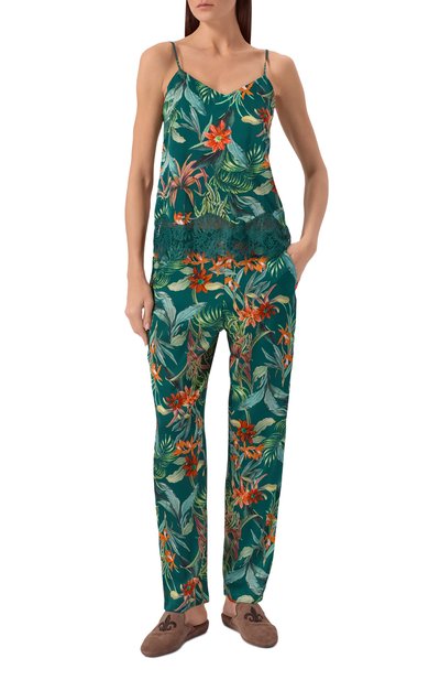 Брюки London с двумя боковыми карманами выполнили из шелкового шармеза с принтом Persimmon Bloom. Свободную модель с заниженной посадкой дополнили широким поясом с эластичной вставкой сзади.