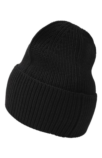 Шапку с широким отворотом, плотно облегающую голову, связали из шерстяной пряжи. Аксессуар с фактурным узором украсили объемной надписью Icon, завершив декор тисненым логотипом.