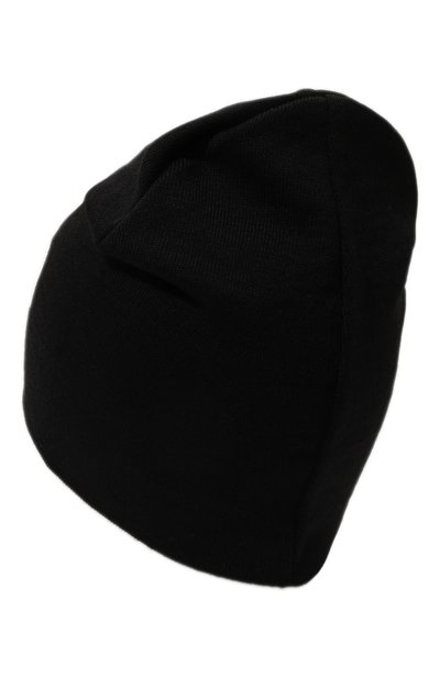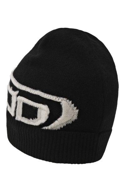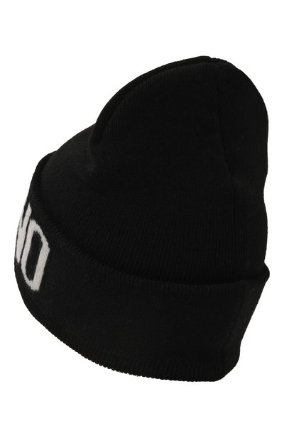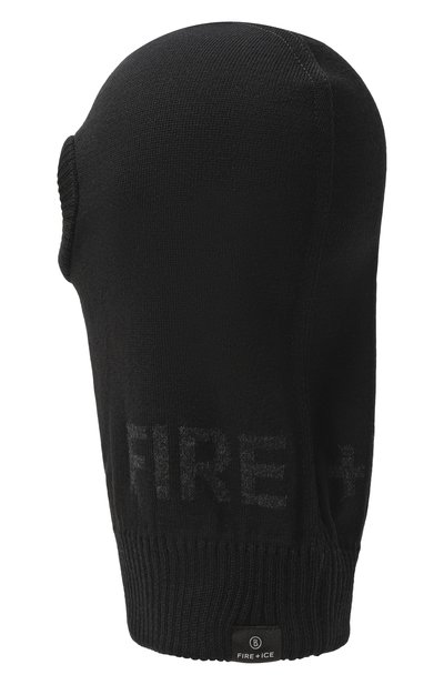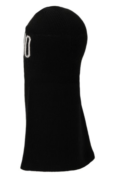 Балаклаву с длинной горловиной связали узором в рубчик из смесовой пряжи с добавлением шерсти и кашемира. Спереди модель декорировали контрастным жаккардовым логотипом.