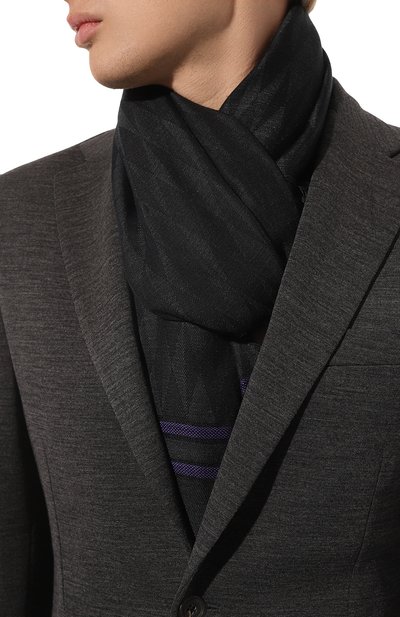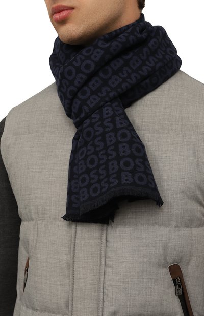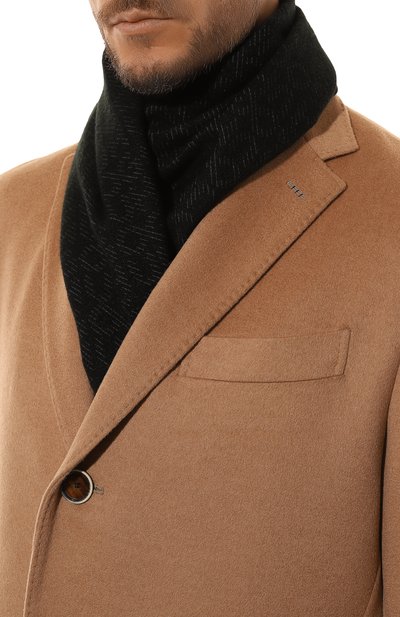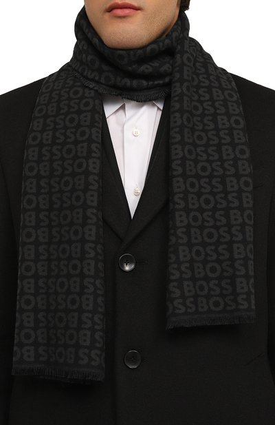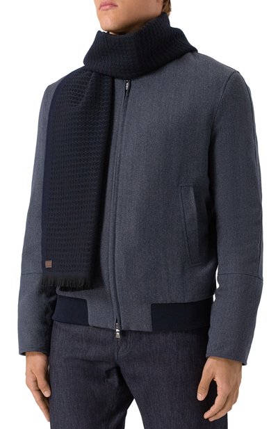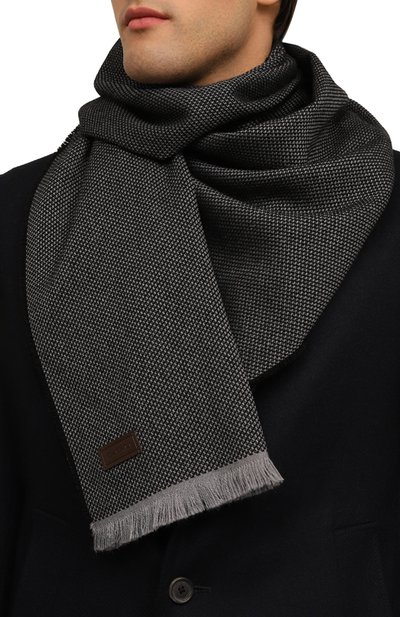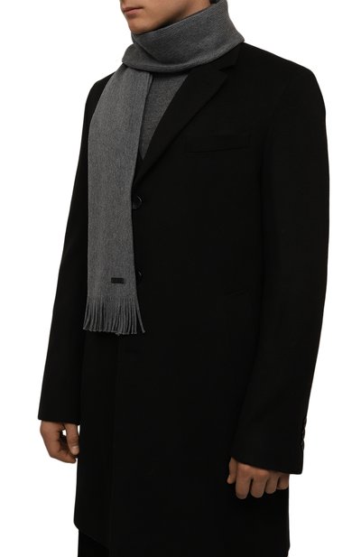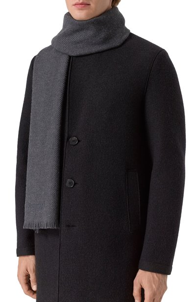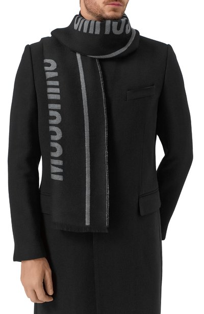 Шарф с жаккардовым паттерном из фирменной эмблемы Double Question Mark выполнили из шерсти. Края изделия подчеркнули короткой бахромой.