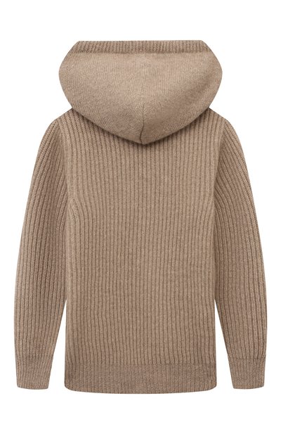 Меланжевый кардиган с рельефным арановым узором спереди и на рукавах связали из кашемировой пряжи, поддерживающей комфортный микроклимат. Удлиненную модель с высоким воротом дополнили съемным капюшоном.