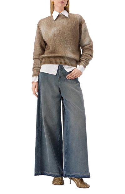 Для изготовления свободного свитера использовали ворсистую тонкую пряжу из нежной шерсти альпака и мериноса, у силенную нитями полиамида и эластана. Драпировку, напоминающую ниспадающий с плеча шарф, закрепили усыпанной кристаллами объемной овальной брошью из серебристого металла.