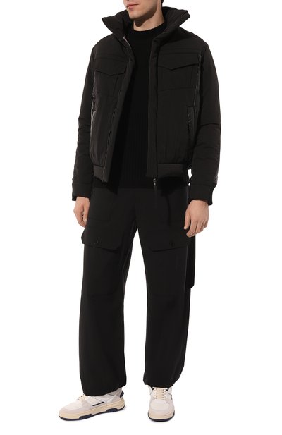 Бомбер с одним внутренним и четырьмя внешними карманами, один из которых расположили на рукаве, сшили из мембранного текстиля, защищающего от дождя и ветра. Куртка с трикотажными поясом, воротом и манжетами, утепленная подкладом Clima Eco 100, застегивается встречной молнией.