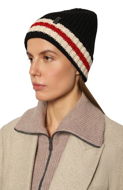 Кашемировую шапку связали крупным узором, напоминающим плетение. Широкий отворот аксессуара украсили аппликацией из сверкающих кристаллов и перламутровых бусин разных размеров.