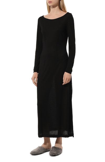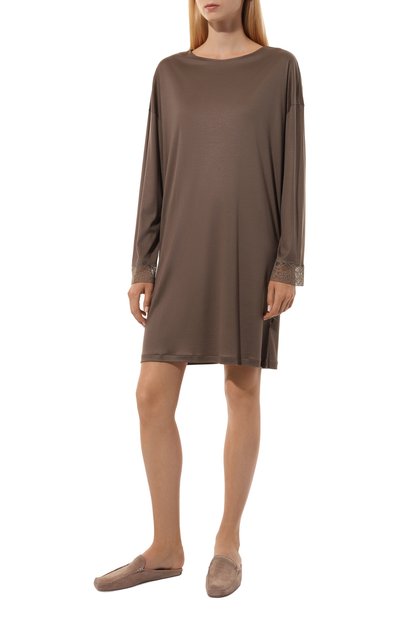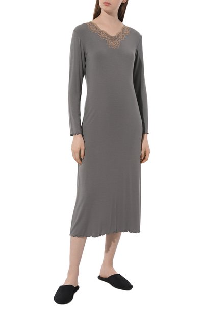 Длинную сорочку сшили из нежного эластичного джерси на основе шелковистого модала с терморегулирующими свойствами, который пропускает воздух лучше хлопка. Глубокий V-образный вырез обрамили ажурным цветочным кружевом Leavers, создав видимость запаха.