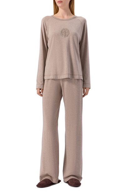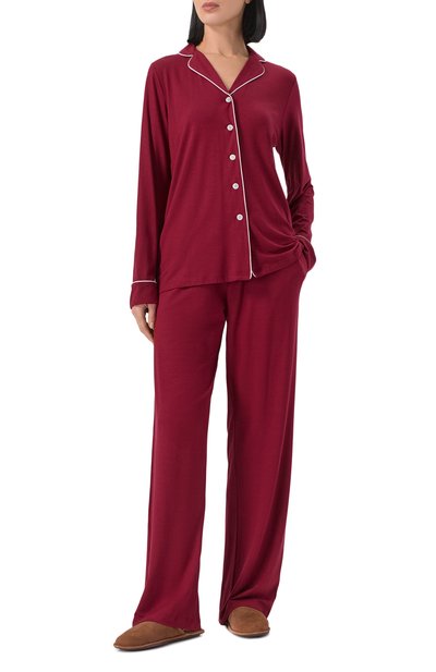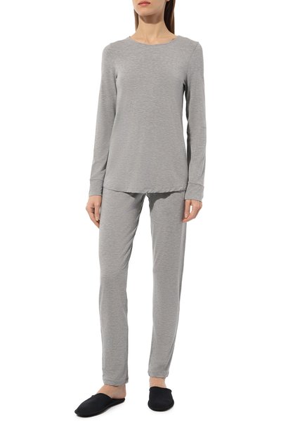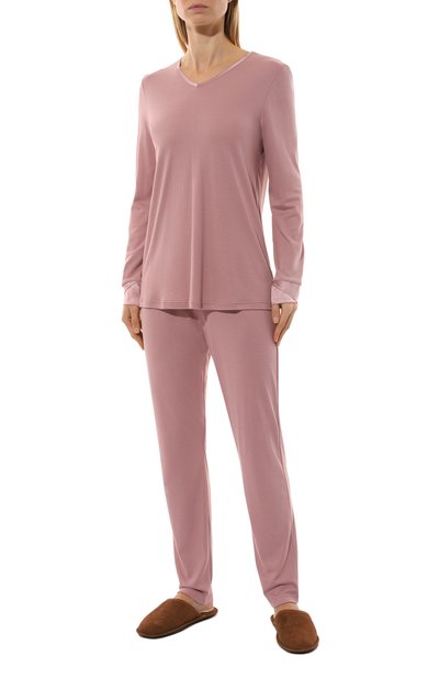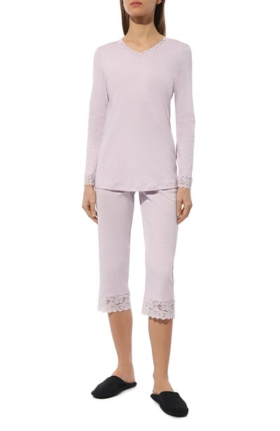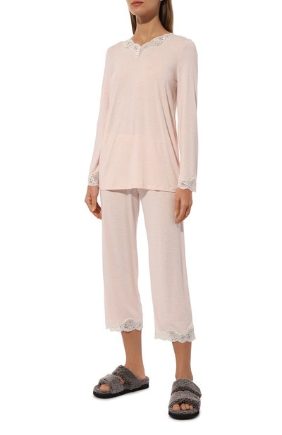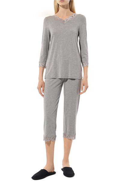Для изготовления пижамы использовали тонкий стрейчевый трикотаж на основе модала с добавлением лайкры. В комплекте – топ с рукавами реглан, декорированный цветочным кружевом спереди, и брюки с эластичным поясом.