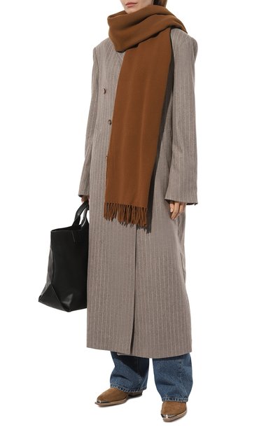 Широкий шарф из плотной фактурной шерсти декорировали контрастным патчем с логотипом бренда. Изделие можно носить как палантин или сложить вдвое и завязать объемным узлом.