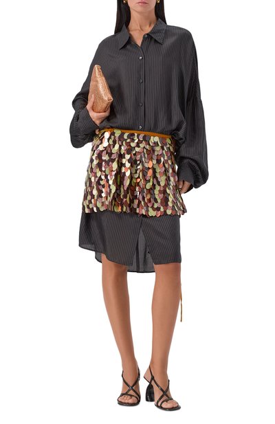 Мини-юбку с бахромой на низе и по краям накладных карманов сшили из шерстяного твида. Модель с кружевной брендированной нашивкой и тремя крупными кристальными пуговицами спереди застегивается на молнию сбоку.