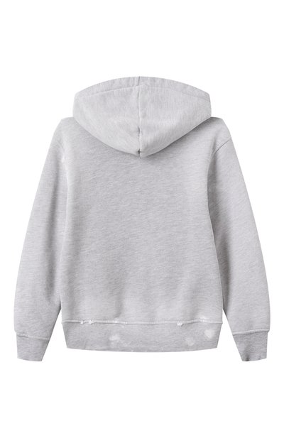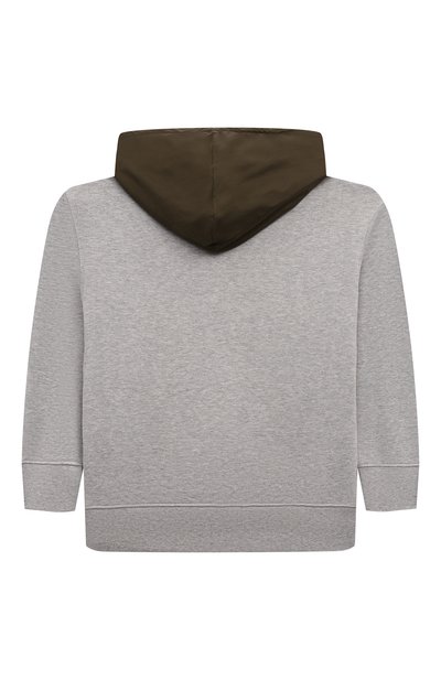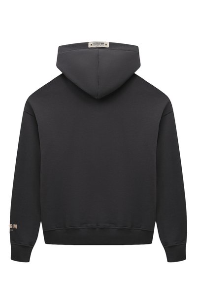 Для пошива худи выбрали плотный гипоаллергенный хлопок с фактурной изнанкой. Капюшон и крупный накладной карман спереди выполнили из полиамида контрастного оттенка. На широком поясе расположили небольшой брендированный патч.