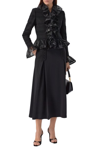 Лаконичная миди-юбка А-силуэта органично дополнит базовый гардероб. Для пошива модели использовали матовую гладкую ткань из вискозы с добавлением шерсти. Изделие, украшенное золотистой цепочкой сбоку, застегивается молнией сзади.