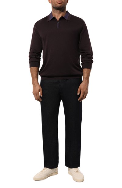 Поло из гладкого трикотажа на основе кашемира и шелка наши стилисты предлагают сочетать с джинсами и кедами. Планку короткой молнии и отложной воротник подчеркнули кантом на несколько оттенков светлее.