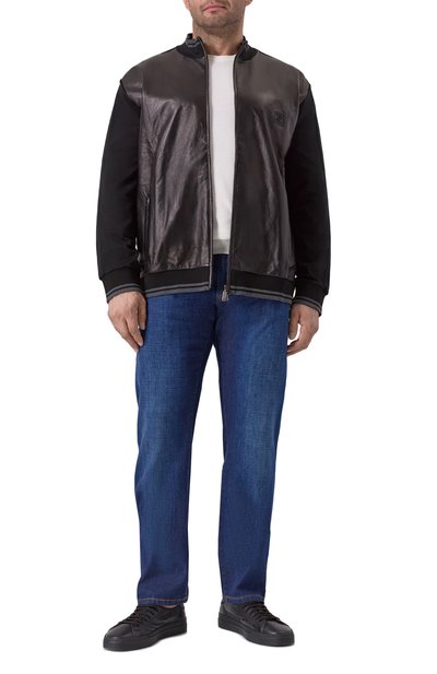 Для создания кардигана прямого кроя использовали гладкий трикотаж на основе шерсти, смешанной с шелком. Передняя панель, выполненная из фактурной замши тонкой выделки, украшена полосками матовой наппы в тон. Два кармана, как и сама модель, застегиваются молниями.