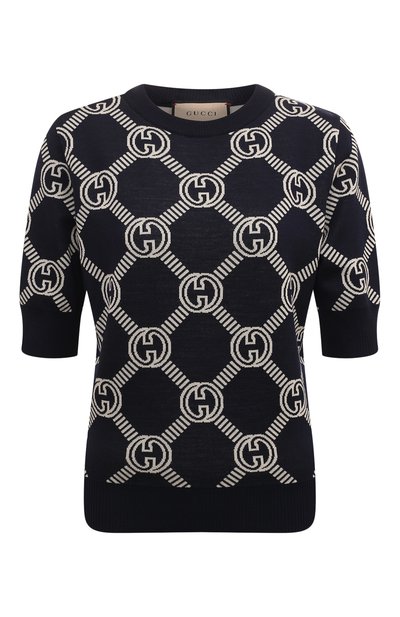 Двусторонний джемпер из капсульной коллекции Love Parade декорировали крупным жаккардовым паттерном с монограммой GG. Модель из гладкого шерстяного трикотажа наши стилисты предлагают сочетать с потертыми джинсами и обувью на каблуке.