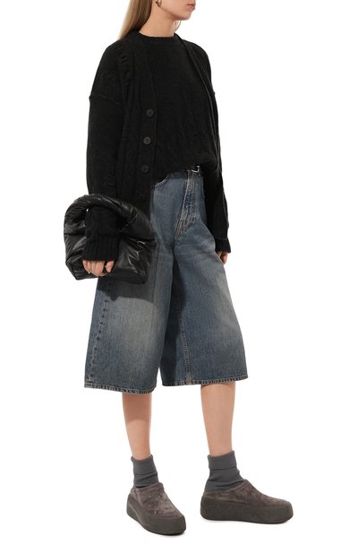 Сабо Creepy выполнили из комбинации бархатистой замши и фактурного текстиля, за счет которого верхняя часть модели напоминает рифленый паголенок носков. Пару дополнили массивной подошвой и украсили тисненым логотипом бренда сзади.