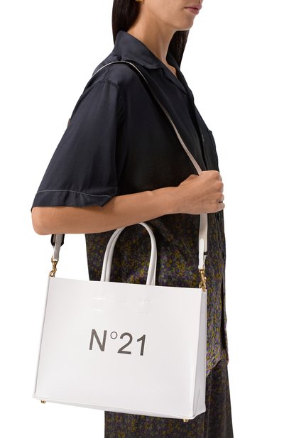 Сумку с двумя короткими ручками и съемным плечевым ремнем сшили из полимера, напоминающего кожу. Внутри предусмотрели карман на молнии. Аксессуар с контрастным логотипом застегивается короткими ремешками с кнопкой.