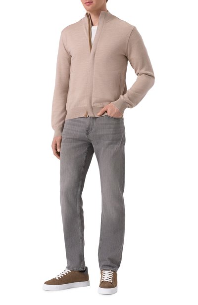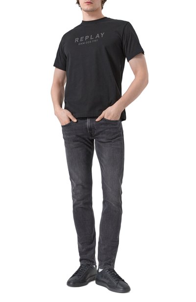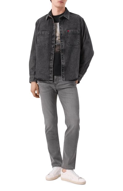 Джинсы прямого кроя сшили из эластичного денима на основе хлопка, выращенного экологичным способом. Слегка выбеленную модель с искусственными заломами декорировали брендированной нашивкой на монетном кармане и патчем с рельефным серебристым логотипом на поясе сзади.