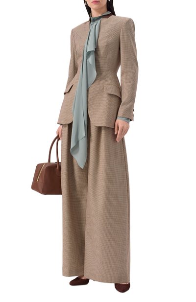 Приталенный жакет, застегивающийся крючком, выполнили из вискозы стрейч, укрепленной нейлоном. Модель с акцентированной линией плеч и удлиненными заостренными лацканами украсили спереди объемной аппликацией в виде цветка в тон.