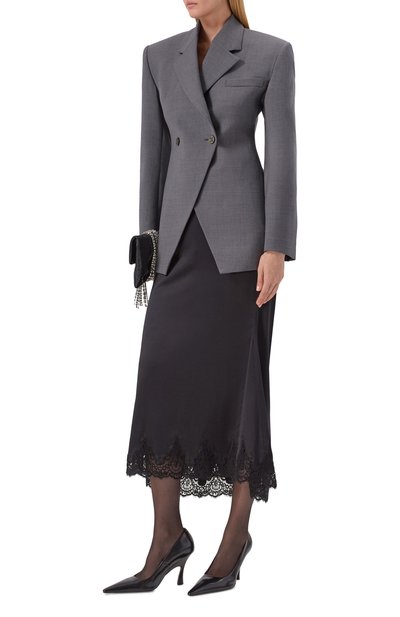 Однобортный пиджак с акцентированной линией плеч сшит из шерсти первого пострига с добавлением эластана. Приталенная модель с внутренним и тремя внешними карманами дополнена крупной брошью с зеркальным блеском.