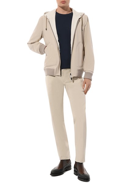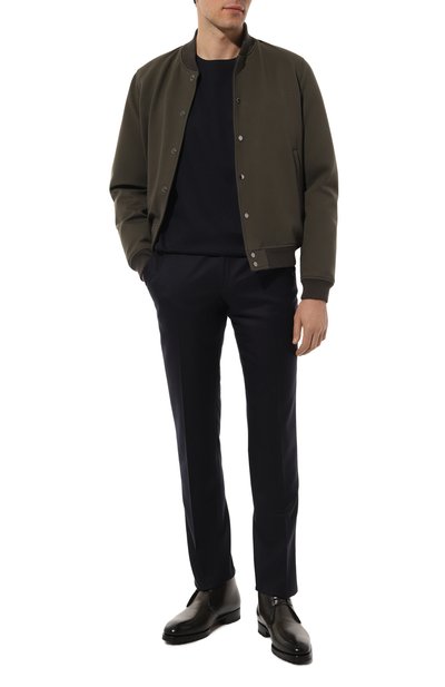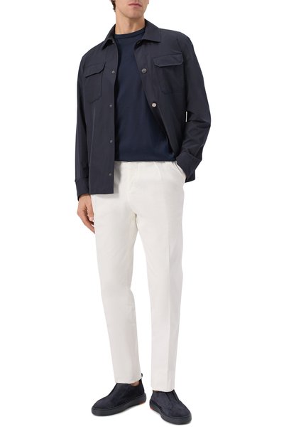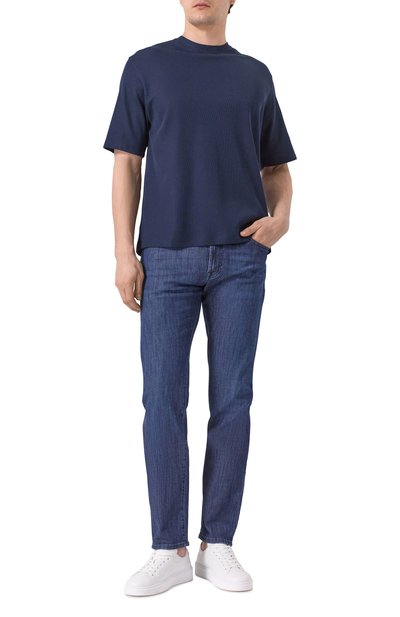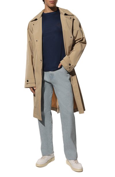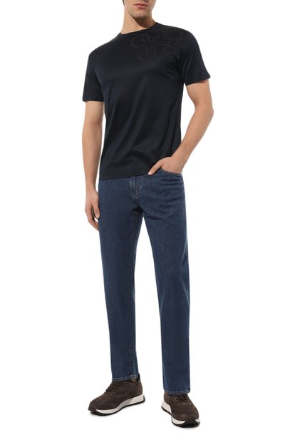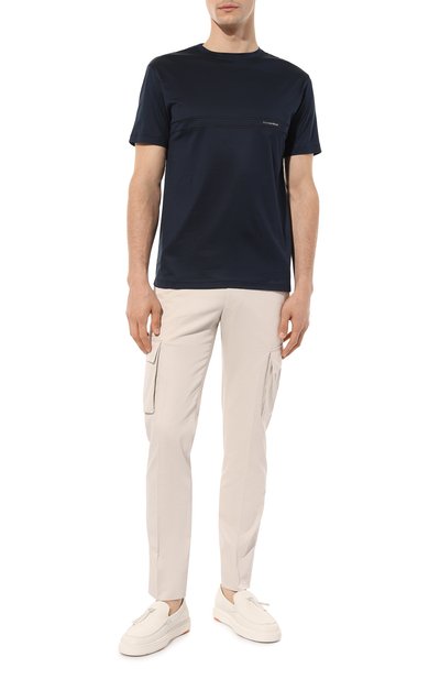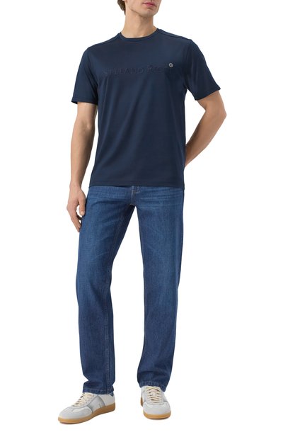 Футболку прямого кроя выполнили из шелкового трикотажа. На груди расположили миниатюрную эмблему с профилем королевского орла, а на левом рукаве — итальянский триколор.
