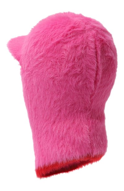 При изготовлении этой шапки бини привычную пряжу заменили на узкие полосы белоснежного меха кролика. Отрезы материала переплели друг с другом, сформировав фактурное бесшовное полотно.