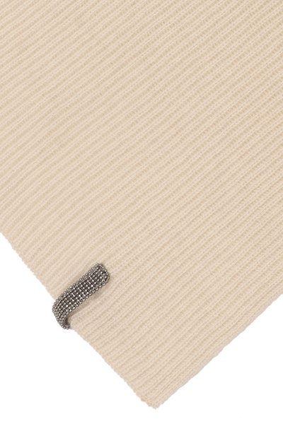 Для изготовления вязаного шарфа с фактурным узором использовали чистый кашемир. Концы модели декорировали помпонами из мягкого меха лисицы.