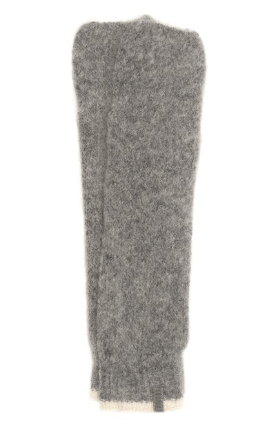 Меланжевые митенки с приятной на ощупь фактурой связали из полушерстяной пряжи с добавлением мохера. Эластичные манжеты с контрастной полосой по краю украсили деталью из цепочки мониль.
