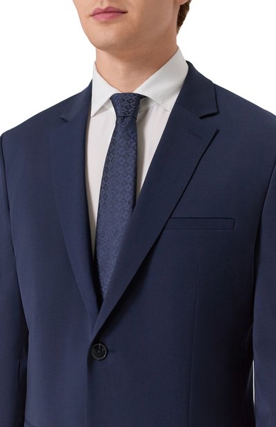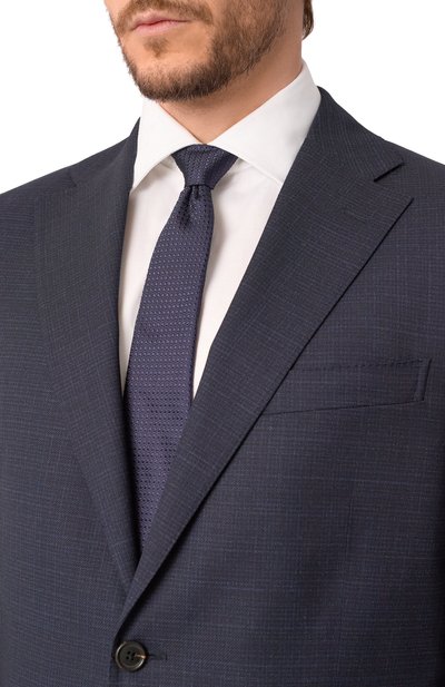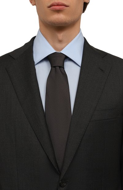 Галстук сшили вручную из плотного шелкового жаккарда с диагональным узором в узкую полоску. Длины аксессуара хватит, чтобы завязать объемный двойной узел.