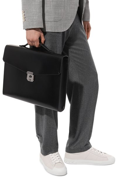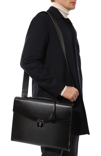Портфель, закрывающийся клапаном на замок-защелку, дополнили внешним и тремя внутренними карманами, один из которых застегивается молнией. Аксессуар с короткой ручкой и регулируемым плечевым ремнем сшили из тисненой кожи. В комплекте — два съемных брелока (с ключом и адресной биркой).