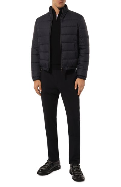 Бомбер с воротником-стойкой, узкими эластичными манжетами и поясом сшили из непродуваемого полиэстера и утеплили тонким синтетическим наполнителем. По бокам предусмотрели прорезные карманы. Верхний замок встречной молнии дополнили кожаным пуллером.