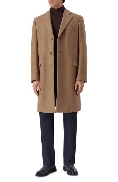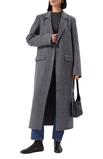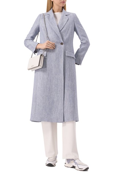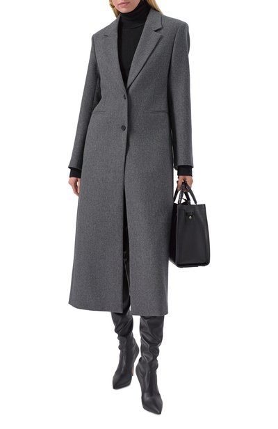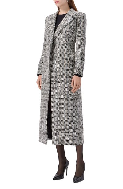 Пальто выполнили из фактурного клетчатого материала на основе шерсти альпака, укрепленной полиамидом. Модель со шлицей дополнили прямоугольными однотонными лацканами.