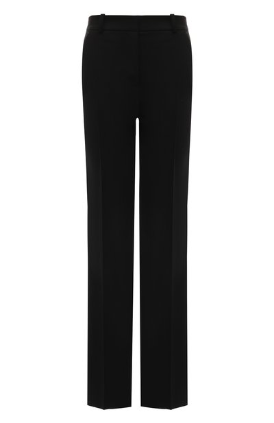 Брюки с высокой линией талии и двумя парами карманов выполнили из шерсти с добавлением эластана. Модель со стрелками органично впишется в офисный или повседневный комплект, например, с пуловером и ботинками.
