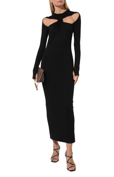 Облегающее миди-платье с высоким воротом и длинными рукавами связали из шерстяной пряжи с добавлением кашемира и эластана. Высокий боковой разрез на подоле подчеркнули широкой драпировкой.