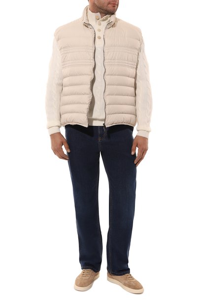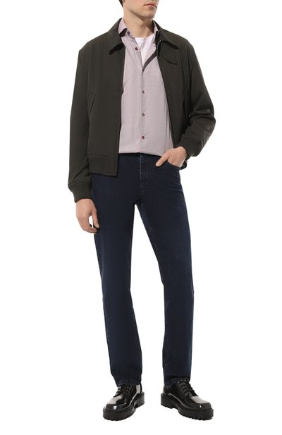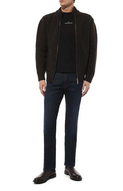 Джинсы прямого кроя выполнили из эластичного хлопкового денима с вискозой. Два из пяти классических карманов украсили фигурной вышивкой. Сзади на широком поясе разместили брендированный жакрон.