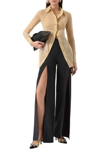 Свободная блуза дополнена широкими лентами, которые можно оставить свободно ниспадать, набросить на плечо или завязать разными способами. Модель из слегка эластичного вискозного кади застегивается потайными пуговицами.