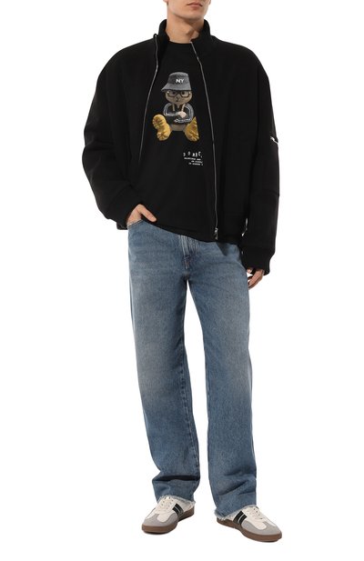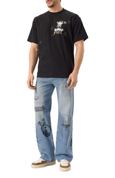 Футболку украсили спереди разноцветным принтом в виде двух плюшевых медведей, логотипа марки и надписи «Любовь». Текстовый мотив продублировали и на спинке. Модель со спущенной линией плеч сшили из хлопкового джерси.