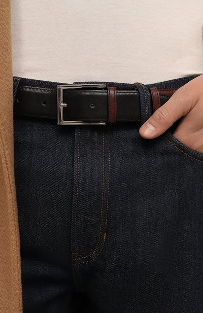 Ремень с одной шлевкой и прямоугольной пряжкой выполнили из кожи с крупным зернением. Аксессуар окрасили пигментами разных оттенков, которые нанесли в несколько этапов, чтобы сформировать патину.