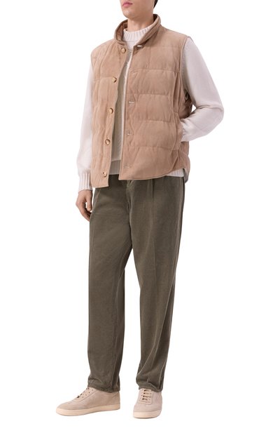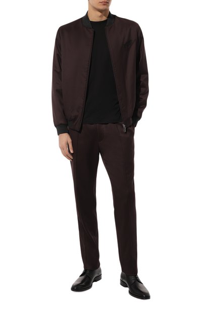 Брюки с проглаженными стрелками выполнили из шерстяной фланели. Модель с регулируемым поясом-кулиской дополнили двумя боковыми и парой прорезных карманов сзади.