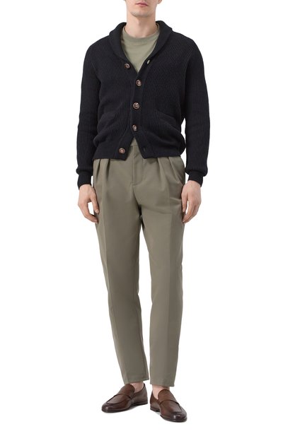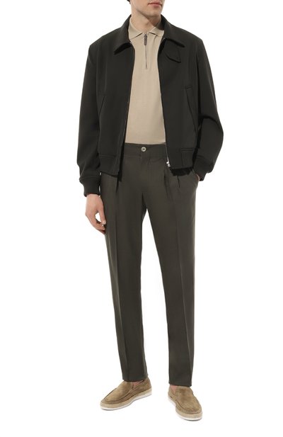 Брюки из шерстяной фланели могут стать основой образа в стиле athleisure. Модель с широким поясом-кулиской и защипами спереди дополнили двумя боковыми и парой прорезных карманов сзади.