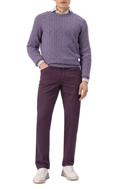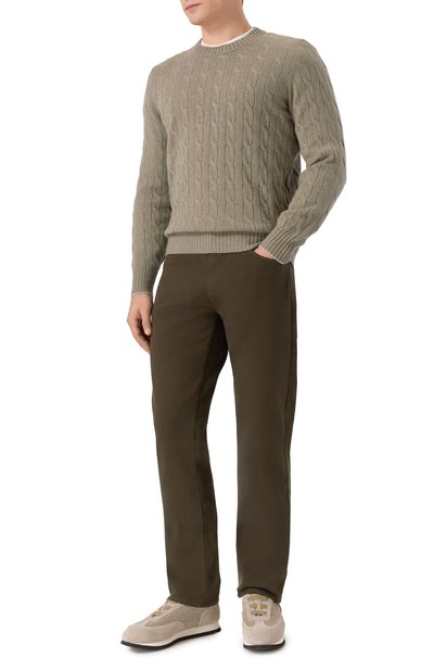 Для создания джемпера с арановым узором выбрали тонкую кашемировую пряжу. Манжеты с контрастной полоской, круглую горловину и пояс выполнили в рубчик.