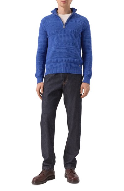 Джемпер с арановым узором связали из кашемировой пряжи. Модель с отделкой в рубчик и контрастными полосами по краю манжет гармонично дополнит повседневный гардероб.