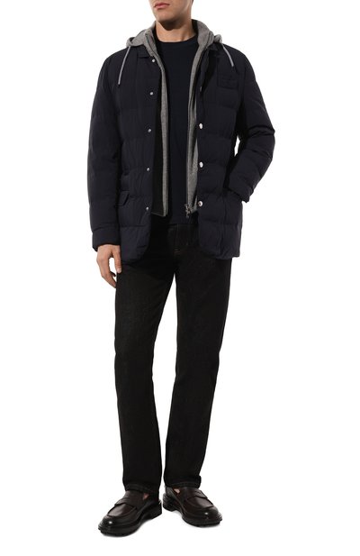 Стеганую куртку на гусином пуху выполнили из стрейчевой нейлоновой тафты с влагозащитной мембраной. Модель с трикотажными манжетами и отделкой на воротнике-стойке дополнили четырьмя внешними карманами, а также парой внутренних и держателем для ручки. Пуховик со съемным капюшоном застегивается молнией под штормовой планкой с кнопками.