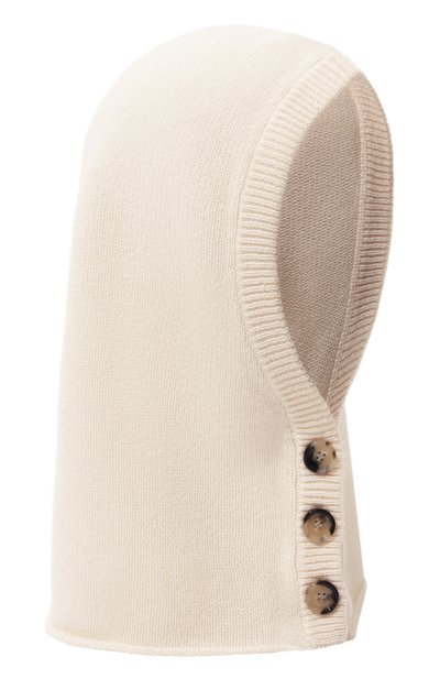 Капор с воротом на пуговицах выполнили из смеси шерсти и кашемира. Модель с эластичными краями в рубчик комфортно прилегает к лицу. Изделие можно сочетать как с классическими пальто, так и с куртками.