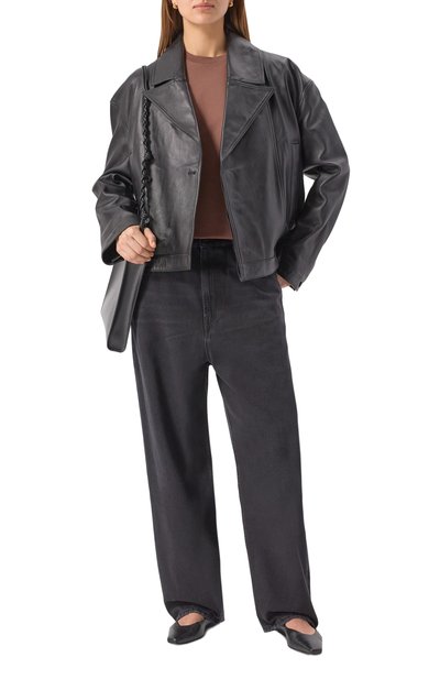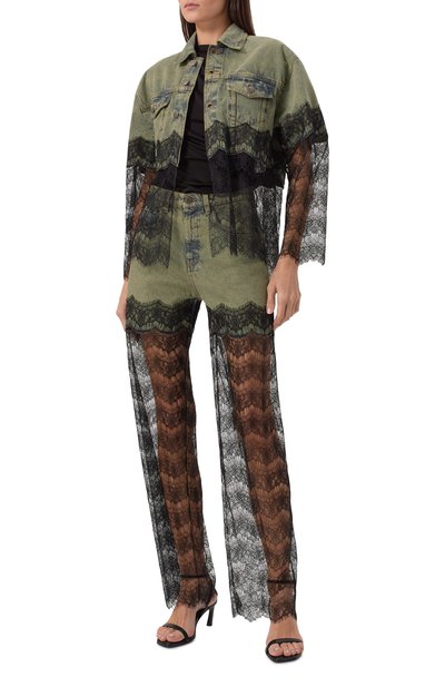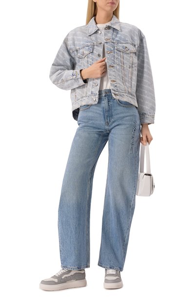 Джинсовую куртку из плотного хлопка, укрепленного эластичными нитями, окрасили в готовом виде, создав мраморный эффект. Модель с четырьмя карманами и патами на поясе по бокам украсили фирменной двухслойной пластиной под отложным воротником сзади.