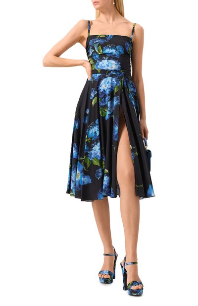 Облегающее миди-платье с открытой спиной сшили из шелкового шармеза с крупным принтом в виде колокольчиков и гортензий. Модель с широкой перекрещивающейся бретелью-петлей и шлицей застегивается на молнию сзади.