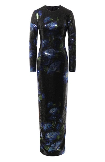 Для изготовления вечернего платья из капсульной коллекции Flower Power использовали полиэстеровый тюль с глянцевым разноцветными пайетками, сложенными в крупный мотив в виде колокольчиков и гортензий. Облегающая модель с разрезом сзади застегивается на потайную молнию.