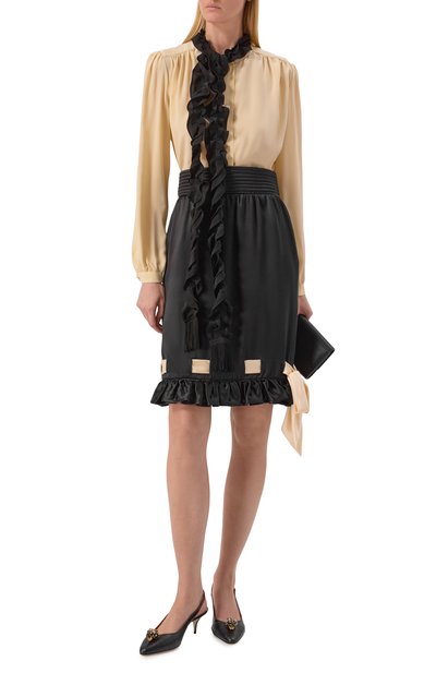 Юбку, застегивающуюся короткой молнией сзади, выполнили в технике кроше из вискозной пряжи с добавлением нейлона. Модель с ажурным узором и широким поясом украсили крупной цветочной вышивкой спереди.