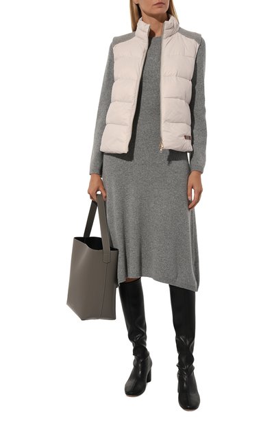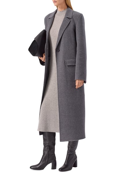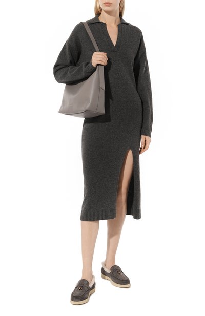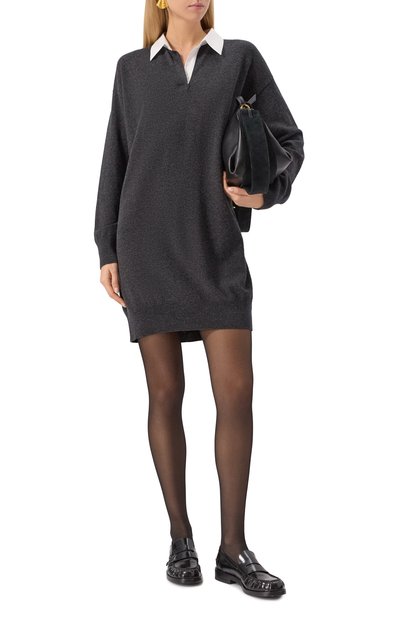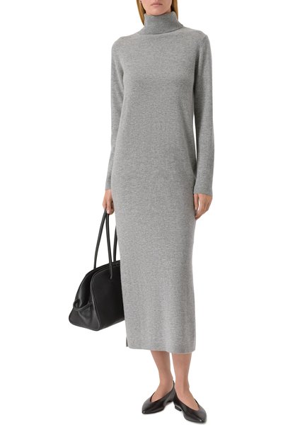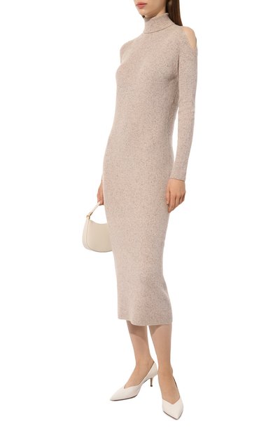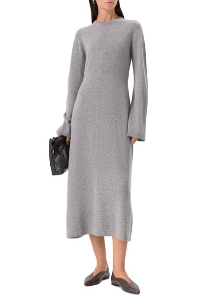 Приталенное миди-платье с разрезами на длинных рукавах сшили из меланжевой полушерстяной ткани с добавлением стрейчевых волокон. Форме глубокого декольте, открывающего ключицы, вторит фигурный вырез на подоле, высоко обнажающий ногу.
